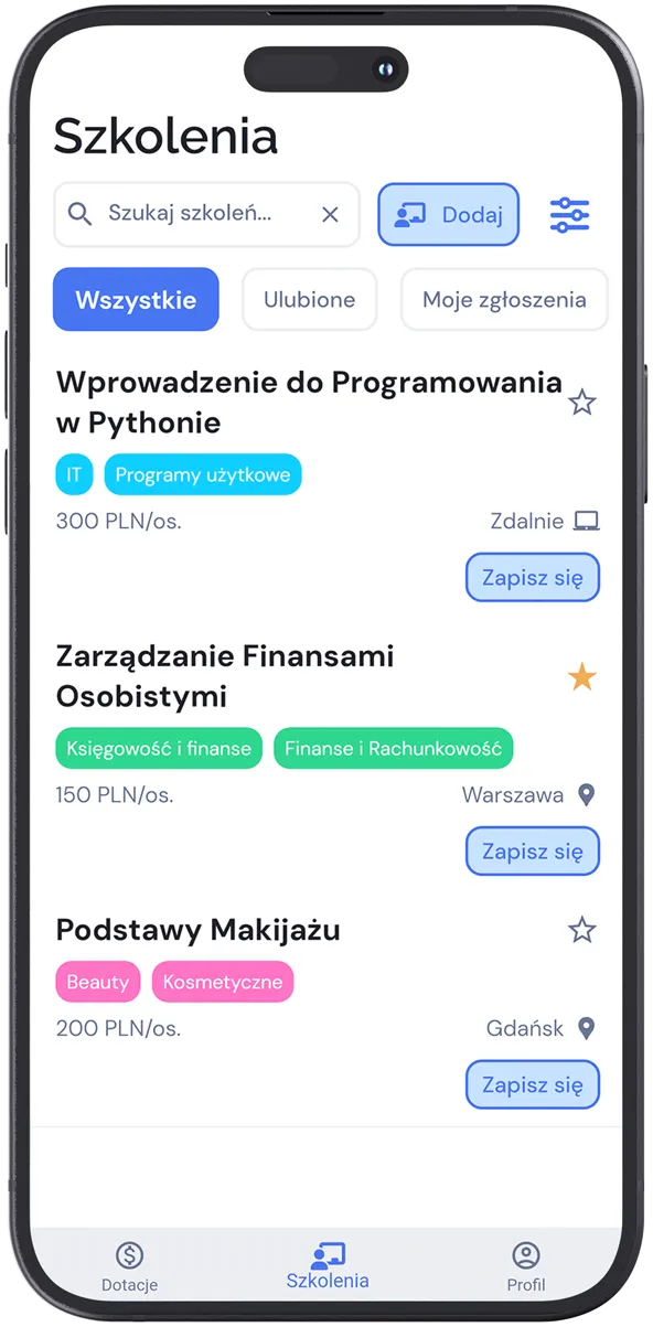 Znajdź interesujące szkolenia w jednym miejscu. Nasza aplikacja umożliwia szybkie i łatwe wyszukiwanie szkoleń według Twoich preferencji.